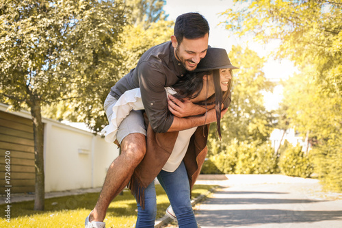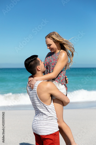 Two people, man and woman on the beach by the sea, boyfriend carrying his girlfriend on shoulders.